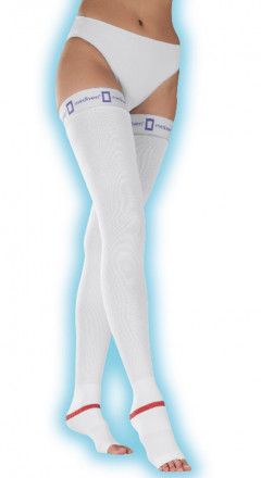- Силиконовая резинка в верхней части обеспечивает удобную фиксацию изделия и имеет особый индикатор, который служит для контроля отсутствия препятствия венозному оттоку