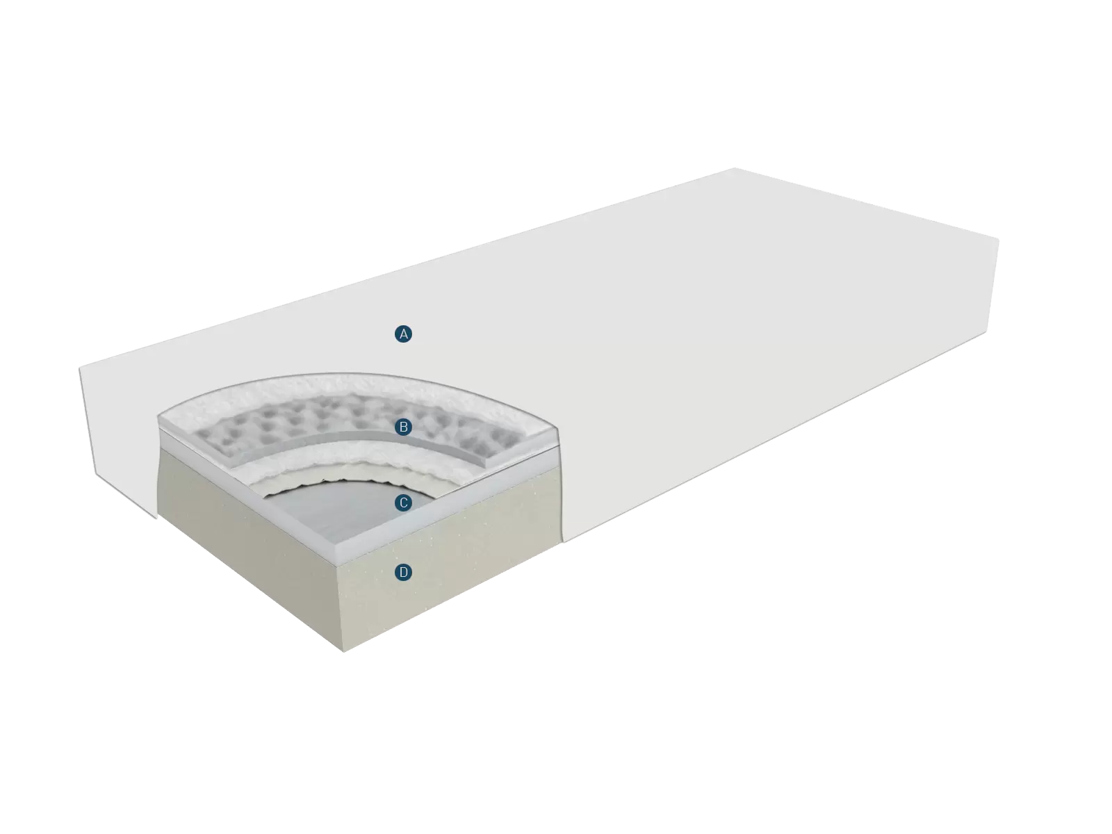 Устройство матраса Massaggio Light: технологии комфортаТрехслойная система для идеального снаA. Инновационный 3D-чехолВнешний слой выполнен из ультрасовременной 3D-ткани на основе натуральной вискозы, которая обеспечивает: